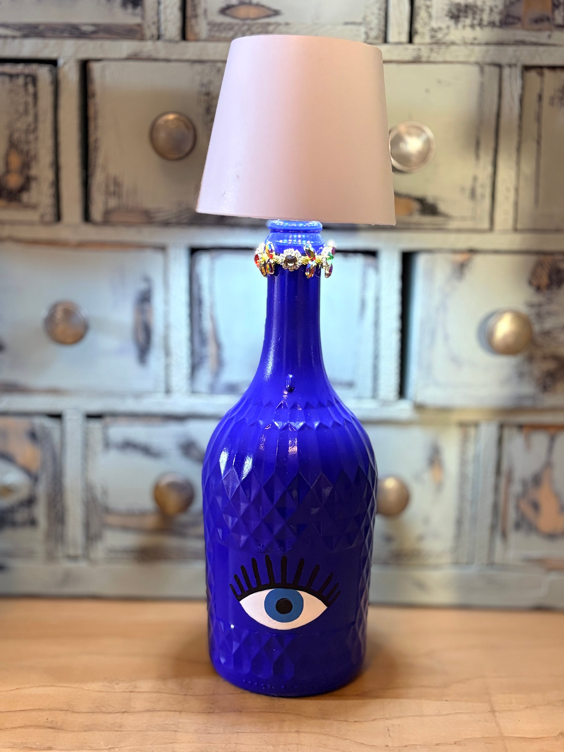 Chaque bouteille est soigneusement nettoyée, retravaillée, peinte et décorée pour lui offrir une seconde vie lumineuse.